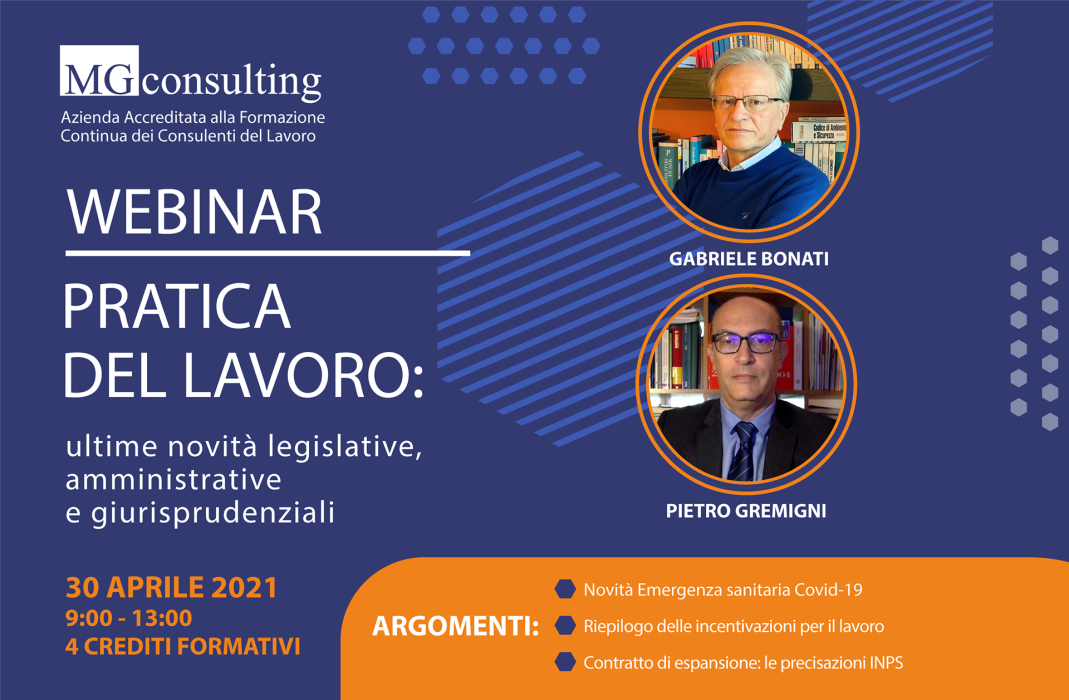 Rapporto di lavoro 30 Aprile 2021 | Webinar di aggiornamento accreditato sulle ultime disposizione in materia di lavoro e il riepilogo delle incentivazioni. 16 Aprile 2021